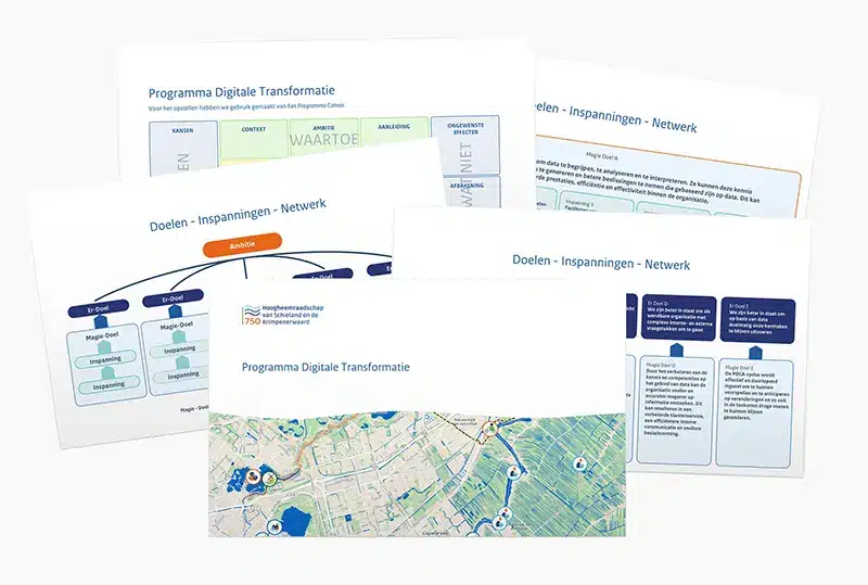 Tijdens de programmasprint is het programmavoorstel ontwikkeld. Gedurende drie projectdagen hebben we eerst, via visuele discussies, een volledig programmacanvas voor de digitale transitie opgesteld. Vervolgens heeft het team, bestaande uit de programmamanager en informatiecoördinatoren van diverse afdelingen, inzichtelijke acties geformuleerd via een Doelen Inspanningen Netwerk (DIN). Deze acties zijn ontworpen om de gestelde doelen te verwezenlijken, zodat ze vanaf 2024 kunnen worden geprogrammeerd.